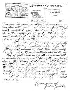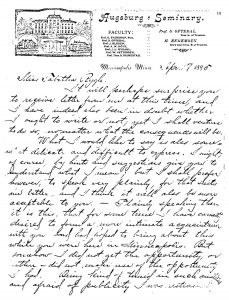 This is the letter written by Johannes Nydahl to Tabitha Gurina Rygh (Agnes Carlsen’s grandparents) in 1895 from Augsburg Seminary.