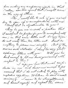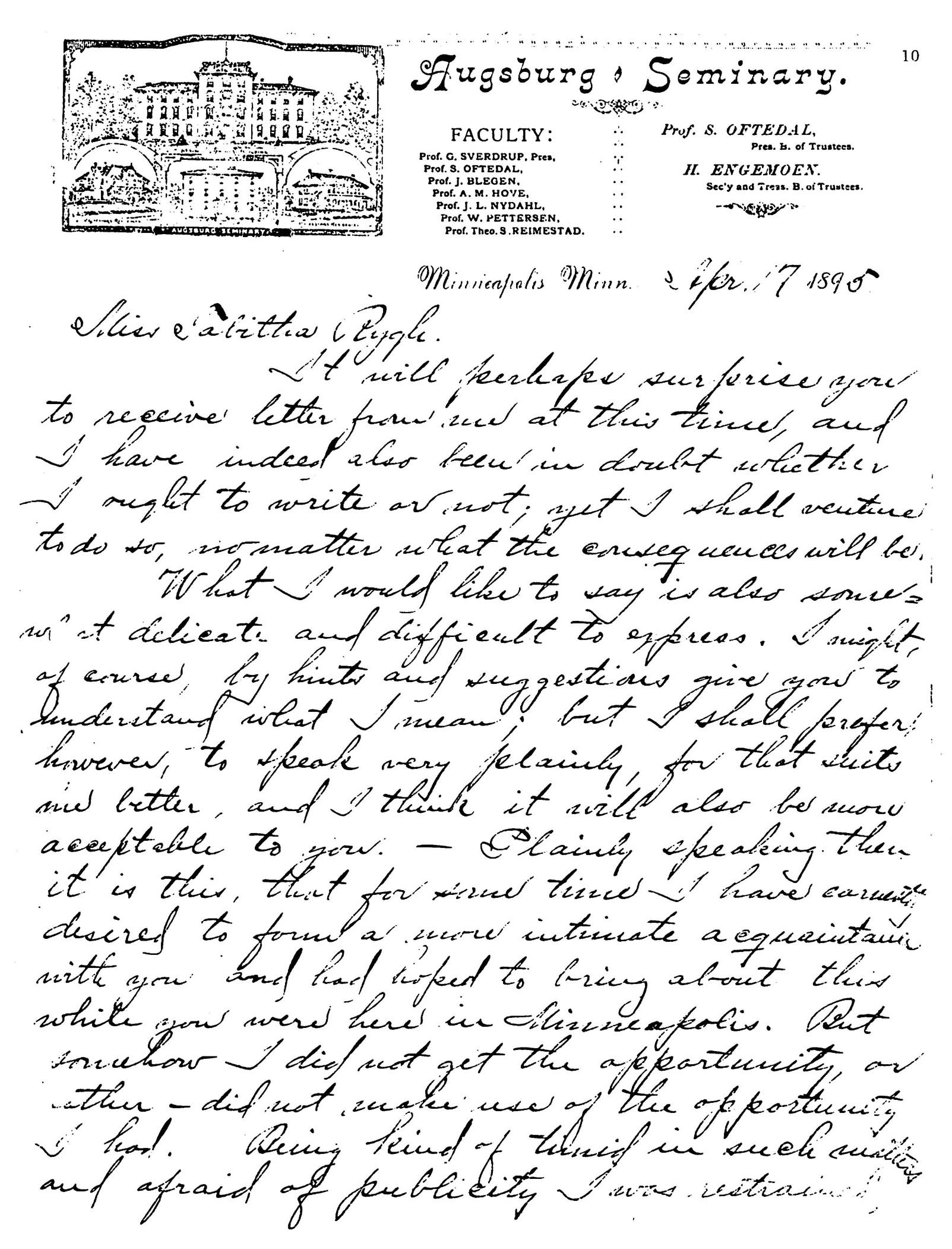 What I would like to say is also somewhat delicate and difficult to express. I might of course, by hints and suggestions, give you to understand what I mean but I shall prefer, however, venture to speak very plainly. That suits me better and I think it will also be more acceptable to you. Plainly speaking, then, it is this. That for some time now I have earnestly desired to form a more intimate acquaintance with you and had hoped to bring about this while you were here in Minneapolis. But somehow I did not get the opportunity, or rather, did not make use of the opportunity I had. Being kind of timid in such matters and afraid of publicity, I was restrained from making any conspicuous effort in that direction. Was also afraid that I might come in the way of others. Now I would like to ask if you are willing to open up a correspondence with me. Would that be objectionable to you?